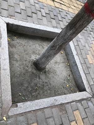 由于天气干燥,人们给树打起了点滴。给绿化地留起了锁水的围栏。